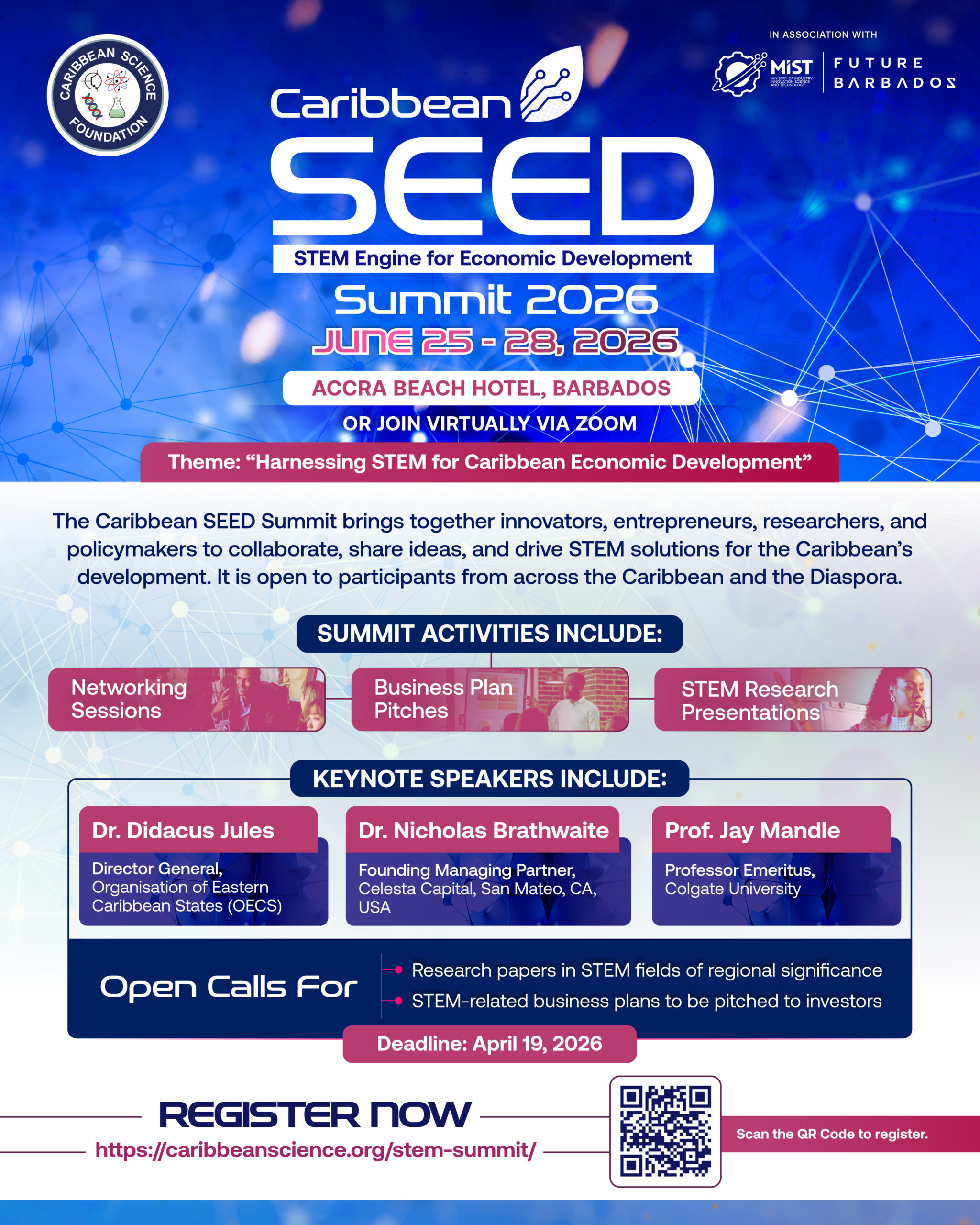 The inaugural Summit is being held in collaboration with the Barbados Ministry of Industry, Innovation, Science and Technology (MIIST), but the Summit will evolve to be a joint initiative of several Caribbean entities. The 2026 SEED Summit will be held in a hybrid mode with the in-person events at the Accra Beach Hotel, Rockley, Christ Church, Barbados. However, all events will be available virtually for full participation on the Zoom platform. The Summit dates are set for 25-28 June 2026. The STEM Startup Challenge business plan pitches (closed to the public) start on Thursday June 25th and continue through June 28th, whereas the main agenda of the Summit starts on Friday 26 June 2026.